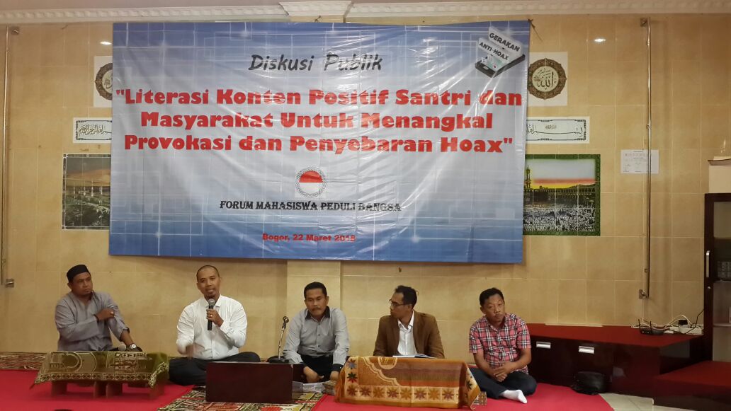 Berlatarbelakang perihal diatas, Forum Mahasiswa Peduli Bangsa (FMPB) bekerjasama dengan Lembaga Studi Informasi Strategis Indonesia (LSISI), menggelar diskusi publik bertema “Literasi Konten Positif Santri dan Masyarakat Untuk Menangkal Provokasi serta Penyebaran Hoax”, pada Kamis (22/3/18). Kegiatan yang dilangsungkan di Pondok Pesantren, Al Ghazali, Kebon Kelapa, Kecamatan Bogor Barat tersebut juga turut mengundang KPU Kota Bogor, MUI, Kepolisian, dan Akademis sebagai narasumber.