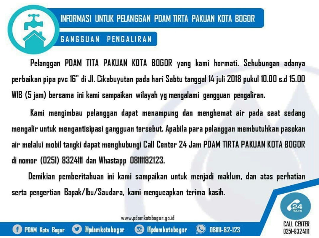 Kami mengimbau pelanggan dapat menampung dan menghemat air pada saat sedang mengalir untuk mengantisipasi gangguan tersebut. Apabila para pelanggan membutuhkan pasokan air melalui mobil tangki dapat menghubungi Call Center 24 Jam PDAM TIRTA PAKUAN KOTA BOGOR di nomor (0251) 8324111 dan Whastapp 08111182123.