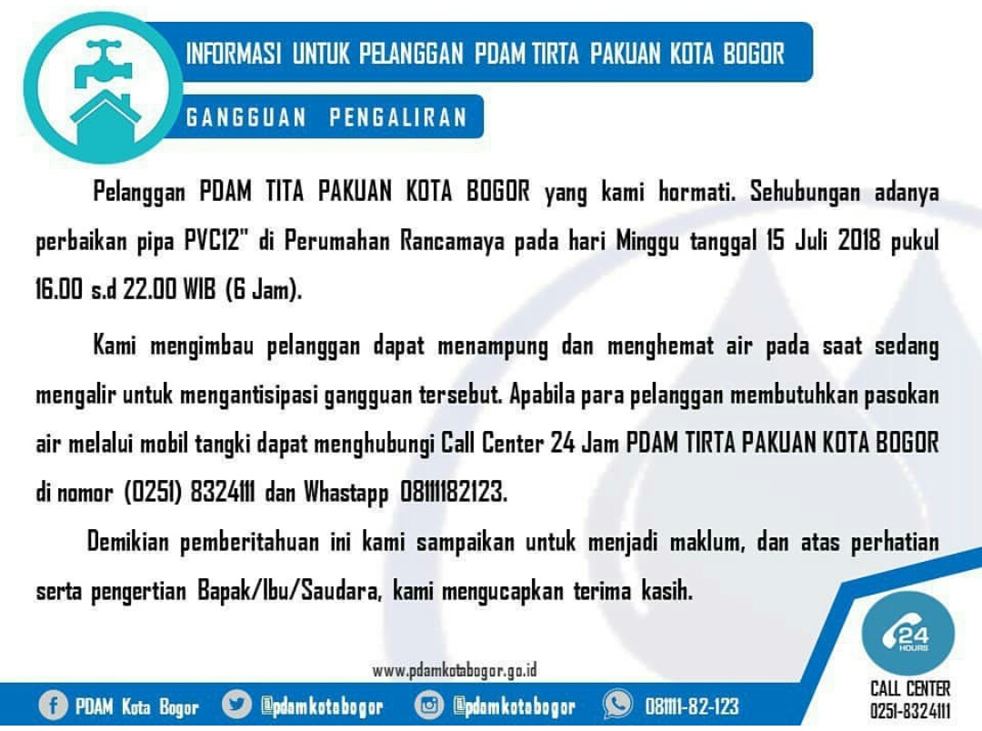 Kami mengimbau pelanggan dapatmenampung dan menghemat air pada saat sedang mengalir untuk mengantisipasi gangguan tersebut. Apabila para pelanggan membutuhkan pasokan air melalui mobil tangki dapat menghubungi Call Center 24 Jam PDAM TIRTA PAKUAN KOTA BOGOR di nomor (0251) 8324111 dan Whastapp 08111182123.