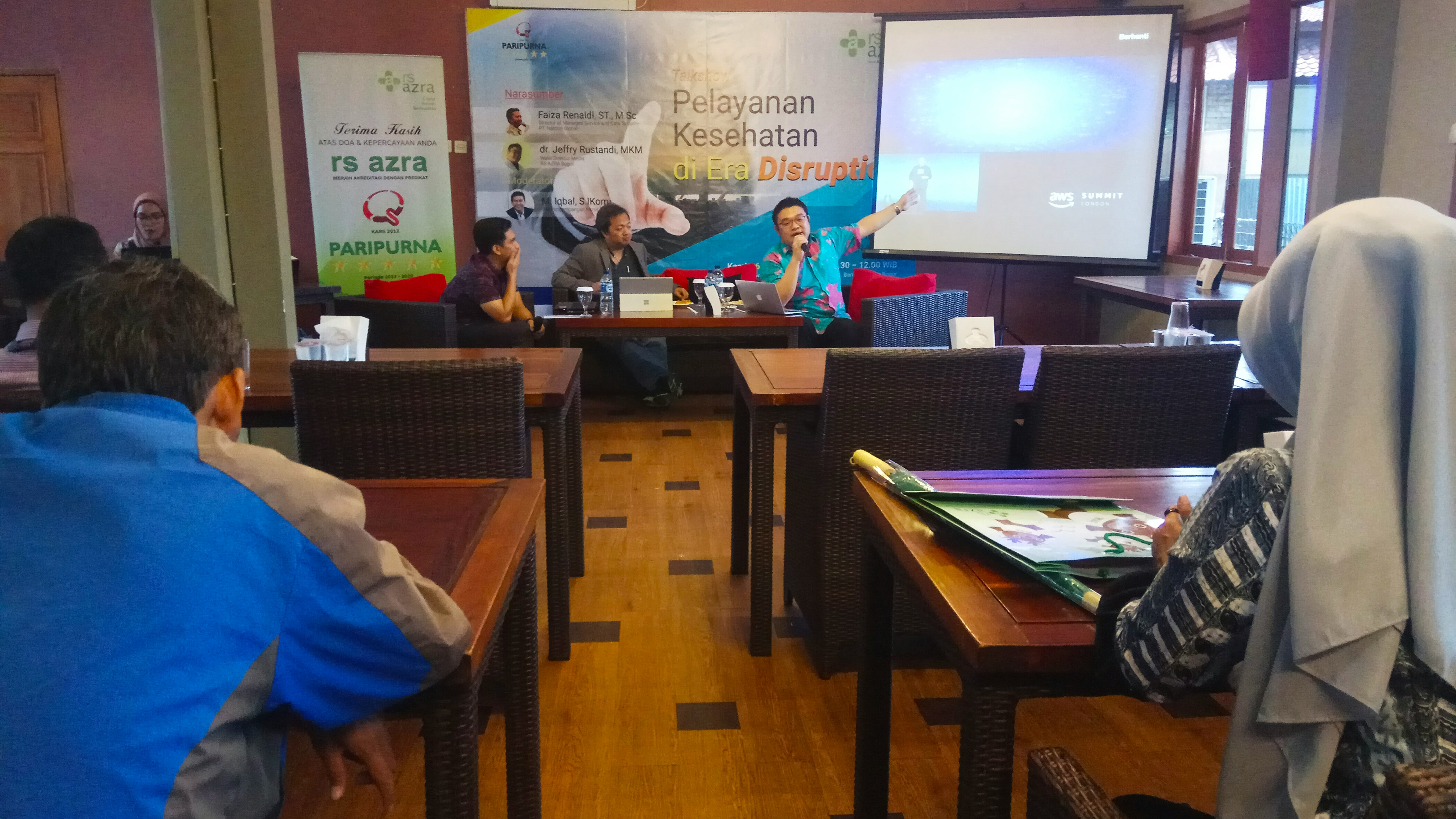 Acara dimulai pukul 10.00, dibuka oleh Riandy S Adha selaku MC, lalu acara dilanjutkan Bapak M.Iqbal S.Ikom (GM Pengembangan Bisnis RS AZRA) selaku moderator. Pemaparan materi pertama oleh Dokter Jeffry Rustandi, MKM selaku Wakil Direktur RS AZRA, beliau menyampaikan beberapa strategi yang dilakukan RS AZRA melakukan pembenahan pelayanan kesehatan menuju smart hospital. RS AZRA bekerja sama dengan PT. Narcon Global untuk mengimplementasikan Rumah Sakit Pintar Berbasis Teknologi Informasi (AZRA Smart Hospital Project) dalam rangka upaya peningkatan pelayanan RS Azra.
