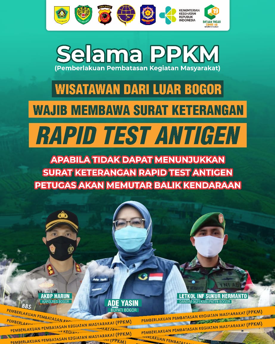 BOGORONLINE.COM, – Ingat baik-baik, bagi Anda yang ingin mengisi waktu libur panjang ke Kabupaten Bogor, harus membawa surat keterangan hasil rapid Antigen dengan hasil negatif. Kebijkan ini berlaku selama Pemberlakuan Pembatasan Kegiatan Masyarakat (PPKM) di daerah tersebut. Bagi yang tidak bisa menunjukan surat rapid Antigen, dipastikan tidak akan bisa memasuki kawasan liburan.