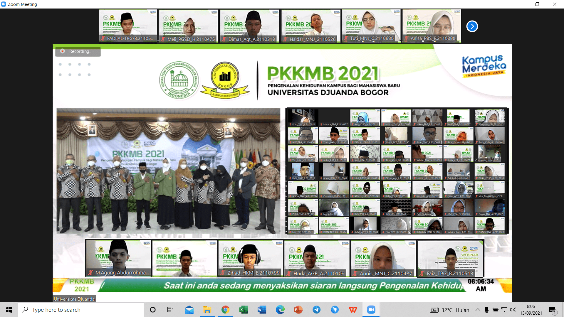 BOGORONLINE.com, Ciawi – Universitas Djuanda (UNIDA) Bogor menyelenggarakan kegiatan Pengenalan Kehidupan Kampus bagi Mahasiswa Baru (PKKMB) Tahun Akademik 2021/2022 secara hybrid di Aula Gedung F bagi para pimpinan Universitas, serta melalui platform Zoom Cloud Meeting dan Live Streaming YouTube bagi para peserta PKKMB 2021. Kegiatan PKKMB ini dilaksanakan selama 3 hari, yakni dimulai dari tanggal 13 sampai dengan 15 September 2021.