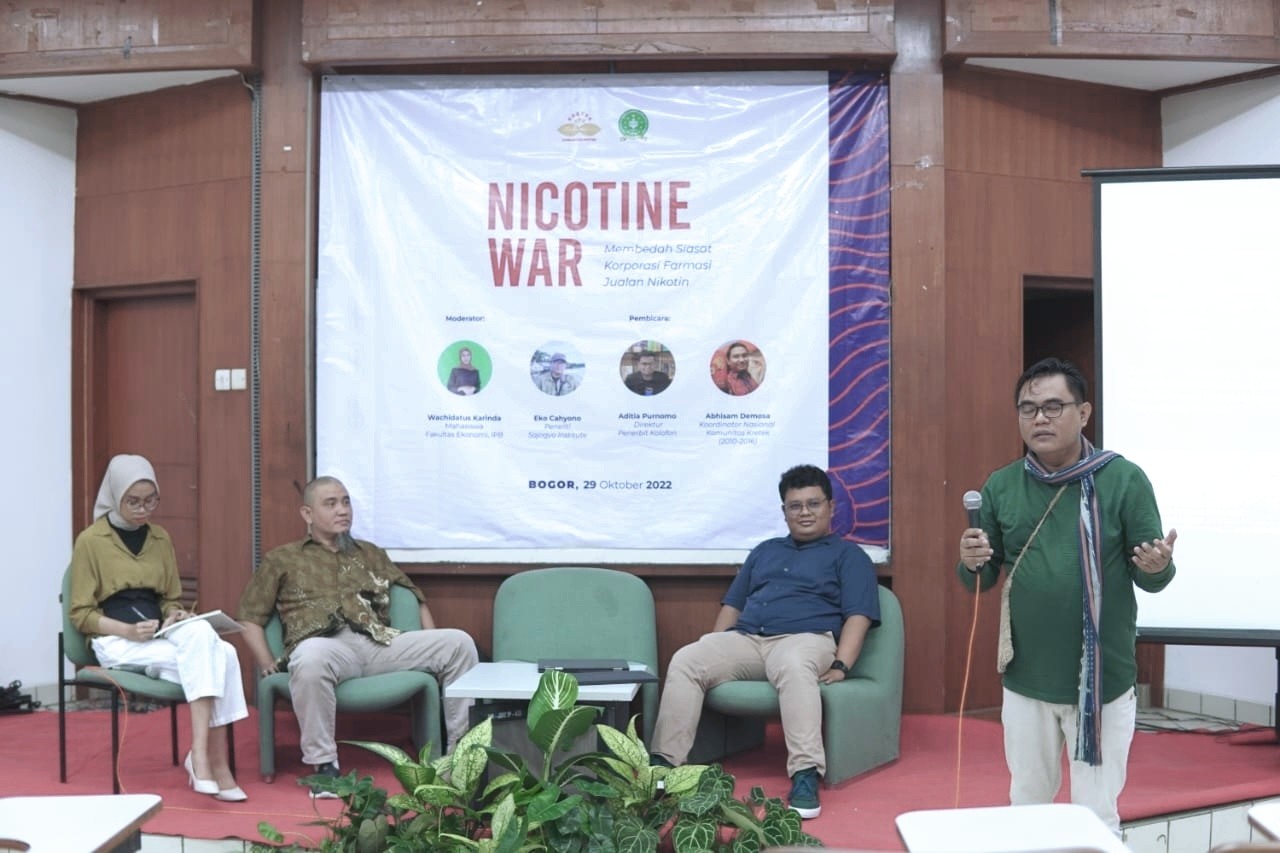 Diskusi bedah buku bertajuk ‘Membedah Siasat Korporasi Farmasi Jualan Nikotin’ ini menghadirkan narasumber Aditia Purnomo (Direktur Penerbit Kolofon dan Penulis “Menjadi Simpul, Menggerakkan Asa), Eko Cahyono (Peneliti Sajogyo Institute, Institut Pertanian Bogor), dan Abhisam Demosa (Koordinator Nasional Komunitas Kretek 2010-2016 dan Penulis buku “Membunuh Indonesia”).