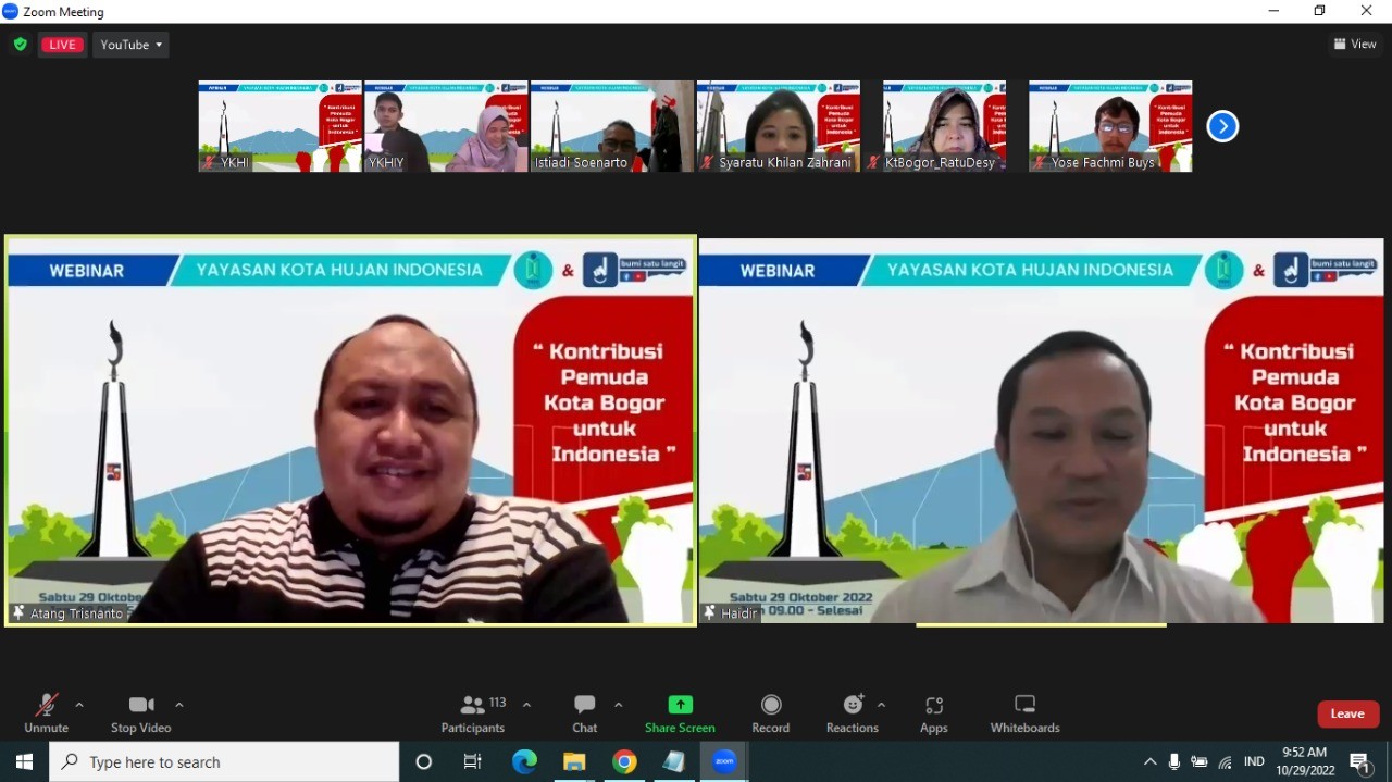 Melanjutkan sambutan RK, Ketua DPRD Kota Bogor, Atang Trisnanto mengapresiasi YKHI yang telah mengabadikan nama Kota Hujan dalam namanya serta inisiatifnya dalam menyelenggarakan webinar ini. Atang menyoroti potensi populasi pemuda yang sangat besar, tantangan dan peluang masa depan serta banyaknya masalah di berbagai sektor yang perlu dituntaskan.