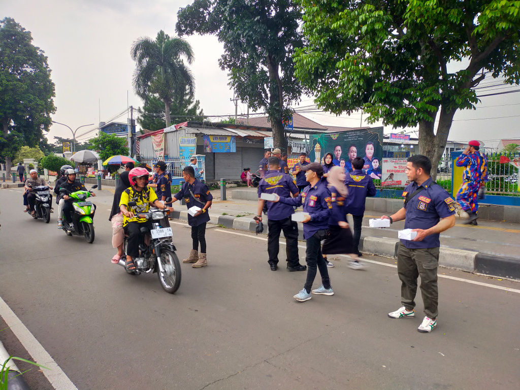 BOGORONLINE.COM – Dipenghujung puasa ramadhan 1445 Hijriah, Lembaga Swadaya Masyarakat (LSM) Laskar NKRI DPC Cibinong, menebar ribuan takjil gratis kepada pengguna jalan yang tengah melintas di areal depan mako DPD KNPI Kabupaten Bogor, Jalan Raya Tegar Beriman, Sabtu (06/4/2024).