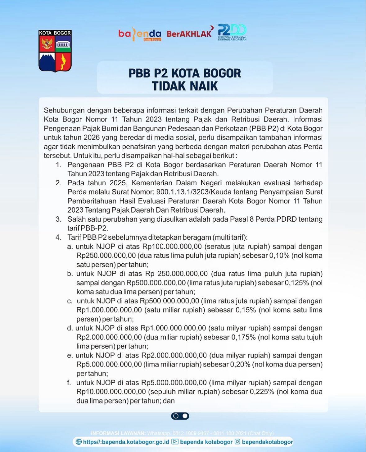 Pemerintah Kota Bogor memastikan tidak ada kenaikan pada tarif Pajak Bumi Bangunan Pedesaan dan Perkotaan (PBB-P2) setelah adanya Perubahan Perda Nomor 11 Tahun 2023 tentang Pendapatan Daerah dan Retribusi Daerah (PDRD).