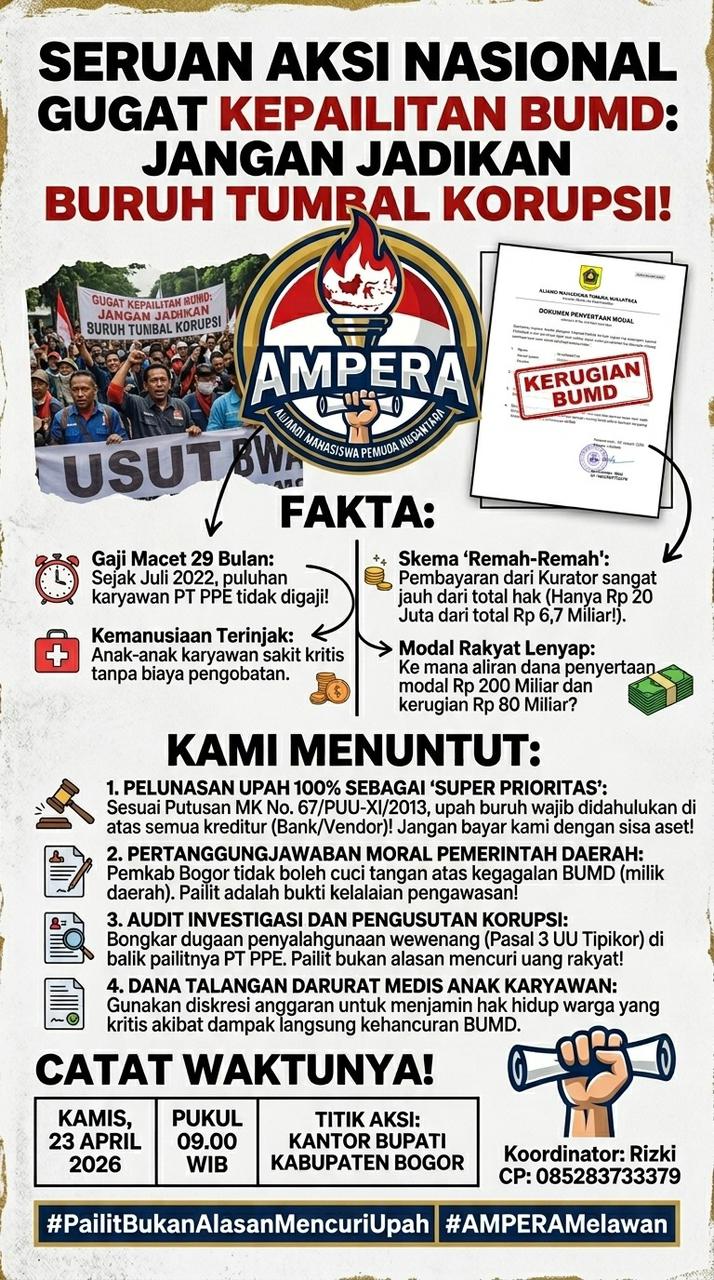 BogorOnline.com – Bau korupsi masih menyengat di tubuh PT Prayoga Pertambangan dan Energi (PT PPE) yang merupakan Badan Usaha Milik Daerah (BUMD) Kabupaten Bogor. Atas dasar itu, Aliansi Mahasiswa Pemuda Nusantara (AMPERA) siap mengepung Kantor Bupati pada Kamis (23/4/2026) mendatang.