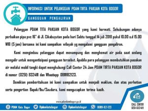 Info perbaikan Pipa PDAM Tita Pakuan Kota Bogorberanda, Kota Bogor|14 July 201814 July 2018by RZ BunaibogorOnline.com Sehubungan adanya perbaikan pipa pvc 16″ di Jl Cikabuyutan pada hari