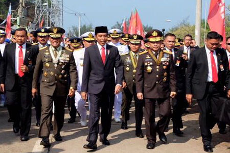Tiga ratus meter menjelang lokasi, Jokowi diapit lima jenderal. Mereka ialah Panglima TNI, Jenderal Gatot Nurmantyo, Kepala Staf TNI Angkatan Darat (KASAD), Jenderal Mulyono, Kepala Staf TNI Angkatan Laut (KASAL), Laksamana Ade Supandi, dan Kepala Staf Angkatan Udara (KASAU), Marsekal Hadi Tjahjanto, serta Kapolri, Jenderal Pol Tito Karnavian.