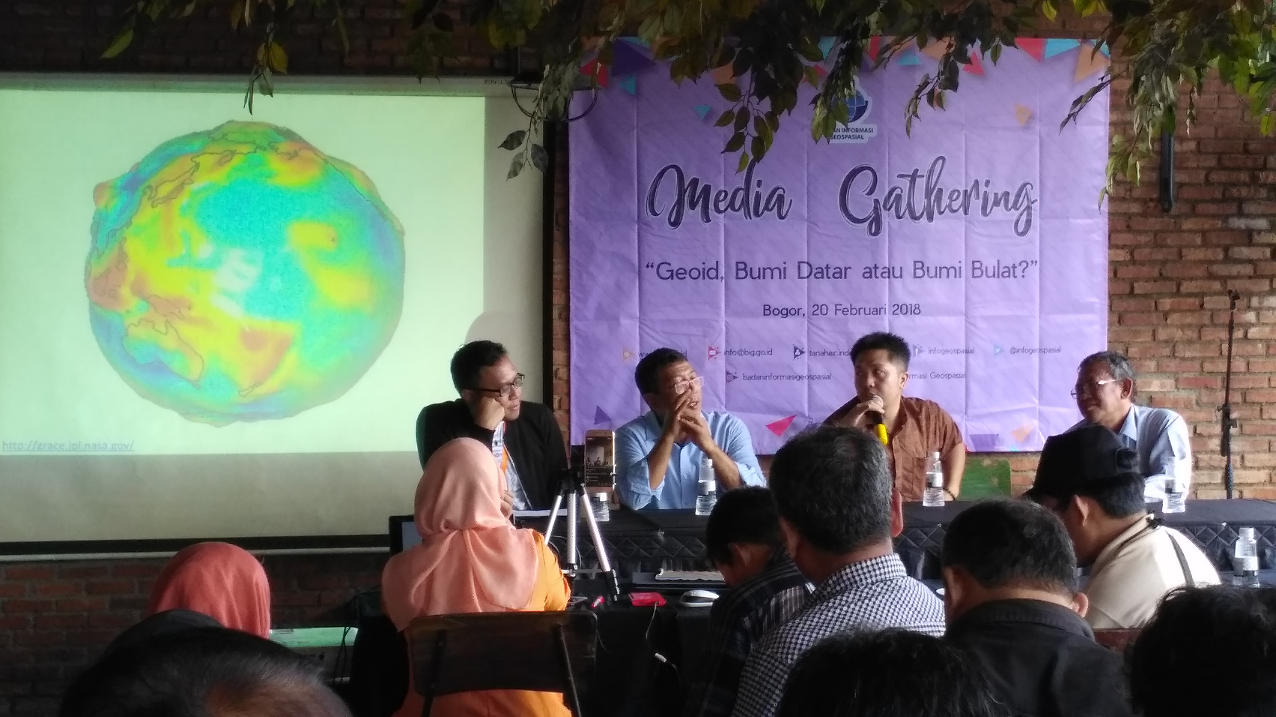 Untuk menjawab fenomena tersebut Badan Geospasial Indonesia (BIG) melalui Pusat Jaring Kontrol Geodesi dan Geodinamika (PJKGG) di sebuah Cafe & Restoran di Kota Bogor mengadakan diskusi dengan tema “Geoid, Bumi Datar atau Bumi Bulat” dengan pembicara Dr. Moedji Raharto Dosen Prodi Astronomi ITB Bandung, Dr. Antonius Bambang Wijanarto Kepala Pusat Jaring Kontrol Geodesi dan Geodinamika, Badan Informasi Geospasial, dan Dr. Heri Andreas ST, MT Dosen Prodi Geodesi dan Geomatika ITB Bandung.