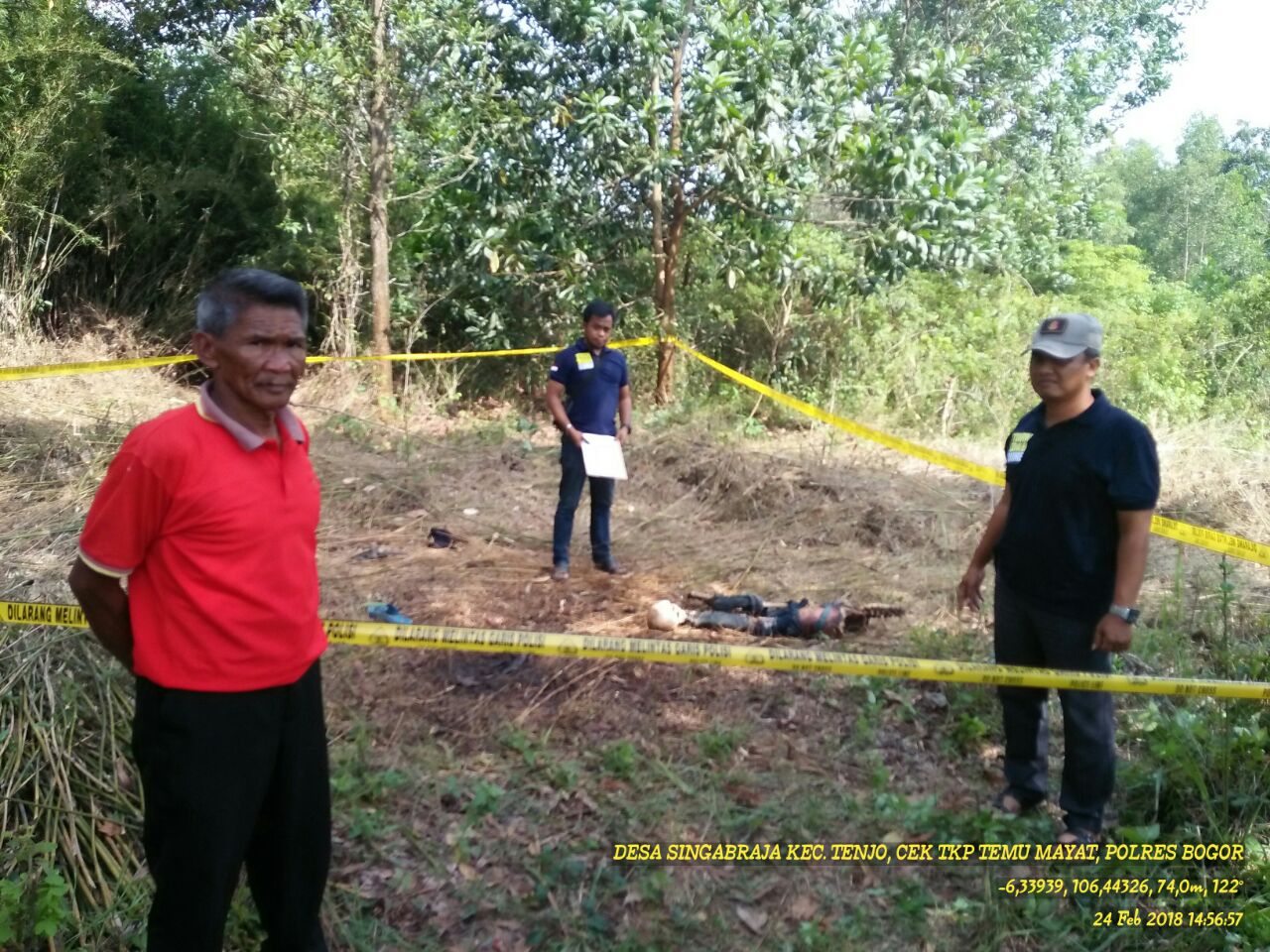 TENJO – Masyarakat di wilayah Kecamatan Tenjo mendadak dihebohkan oleh informasi ditemukannya sesosok mayat di sebuah perkebunan. Penemuan mayat itu terjadi pada hari Sabtu tanggal 24 Februari 2018 sekitar jam 14.00 WIB, di sebuah kebun, tepatnya Kampung. Sukajaya RT 03 RW 01 Desa Singabraja, Kecamatan Tenjo.