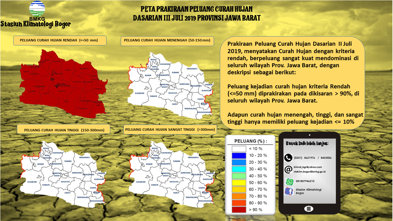 BOGOR – Kabupaten Bogor termasuk dalam daerah berpotensi alami kekeringan. Hal ini berdasarkan informasi peta monitoring hari tanpa hujan Provinsi Jawa Barat yang di update 20 Juli 2019 dan peta analisis curah hujan dasarian II Juli 2019 serta peta prakiraan peluang curah hujan dasarian III Juli 2019 Provinsi Jawa Barat, yang dikeluarkan Stasiun Klimatologi Bogor.