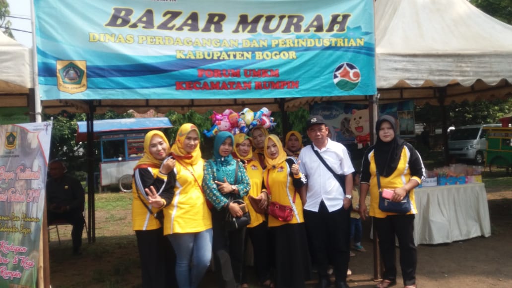 Merekapun (IRT) nampak bersemangat ikut berdagang di Bazaar murah yang digagas oleh Dinas Perindustrian dan Perdagangan (Disperindag) Kabupaten Bogor di halaman kantor Kecamatan Rumpin, Kabupaten Bogor, pada Selasa (26/11/19).