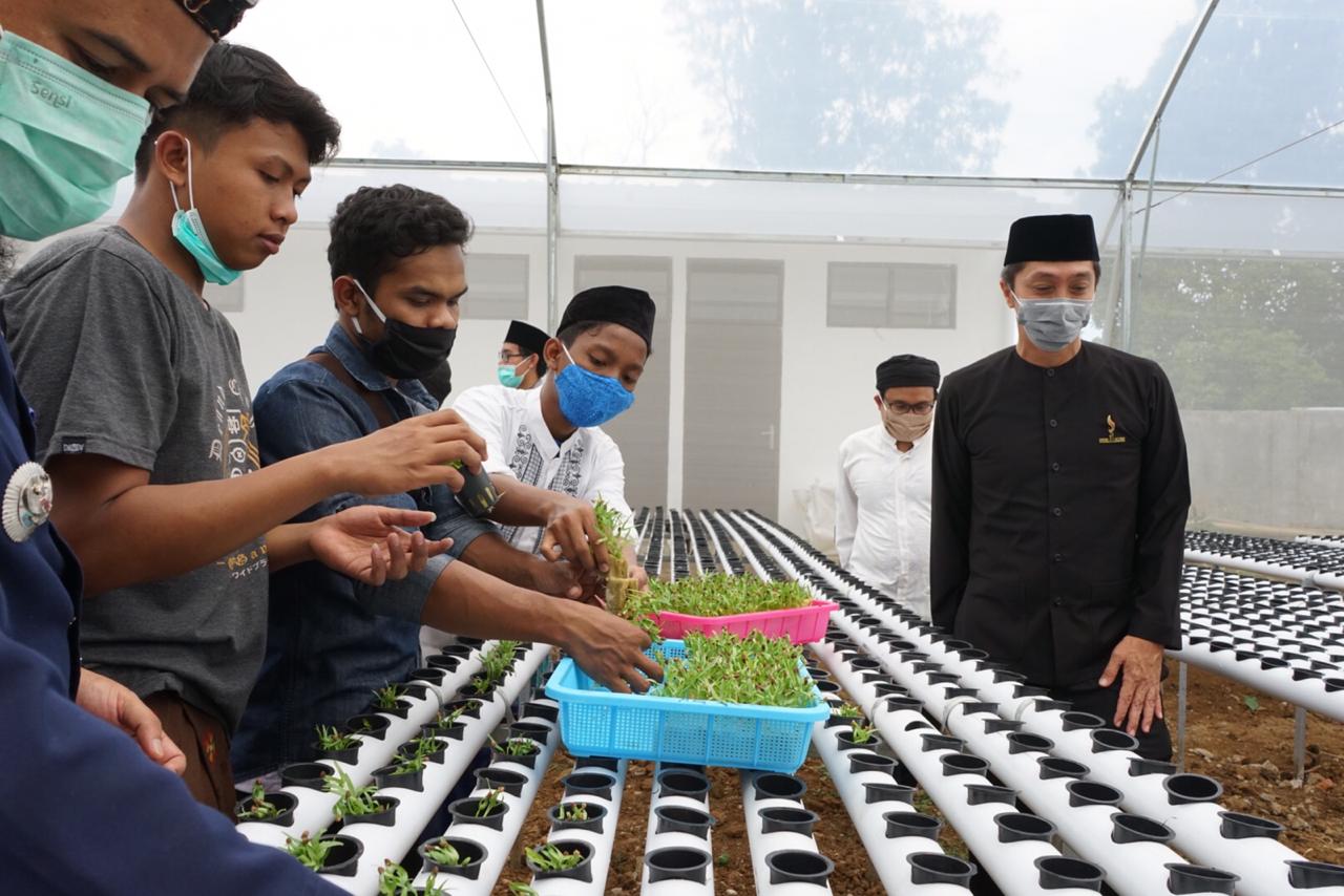 BOGORONLINE.com, Kota Bogor – Wakil Wali Kota Bogor Dedie A. Rachim bersama Direktur Utama Perumda Pasar Pakuan Jaya Muzakkir dan Kepala Dinas Pertanian dan Ketahan Pangan Kota Bogor Anas Rasmana meninjau penanaman perdana sayuran hidroponik di Green House Abdullah Bin Nuh (ABN Farm), Pondok Pesantren Al Ghazaly, Taman Cimanggu, Kecamatan Tanah Sareal, Rabu (16/12/2020).