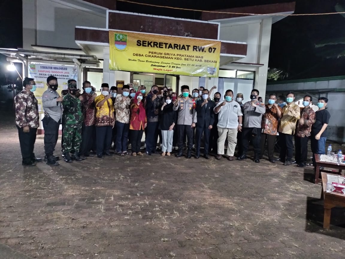 BOGORONLINE.com, CIKARANG – Kepala Kepolisian Sektor (Kapolsek) Setu, Kabupaten Bekasi AKP DR. Dedi Herdiana, S. H, M. H meresmikan Kampung Tangguh Jaya. Kampung tangguh dibentuk untuk menekan penyebaran corona virus disease 2019 (Covid- 19) di Perumaham Griya Pratama Mas (GPM) RW 07 Desa Cikarageman Kecamatan Setu.