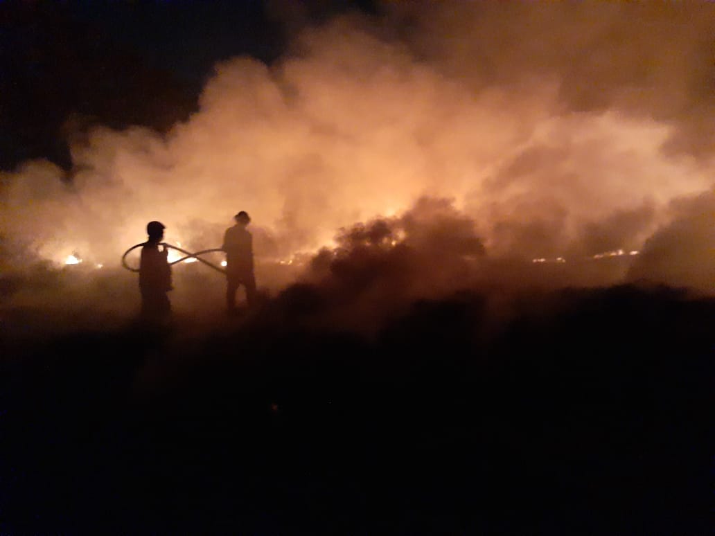 Terlebih api terlihat masih menyala di beberapa titik bagian limbah ban, dan kepulan asap yang menjulang ke langit mengisyaratkan bahwa di bagian dalam tumpukan limbah ban tersebut masih menyimpan bara api.