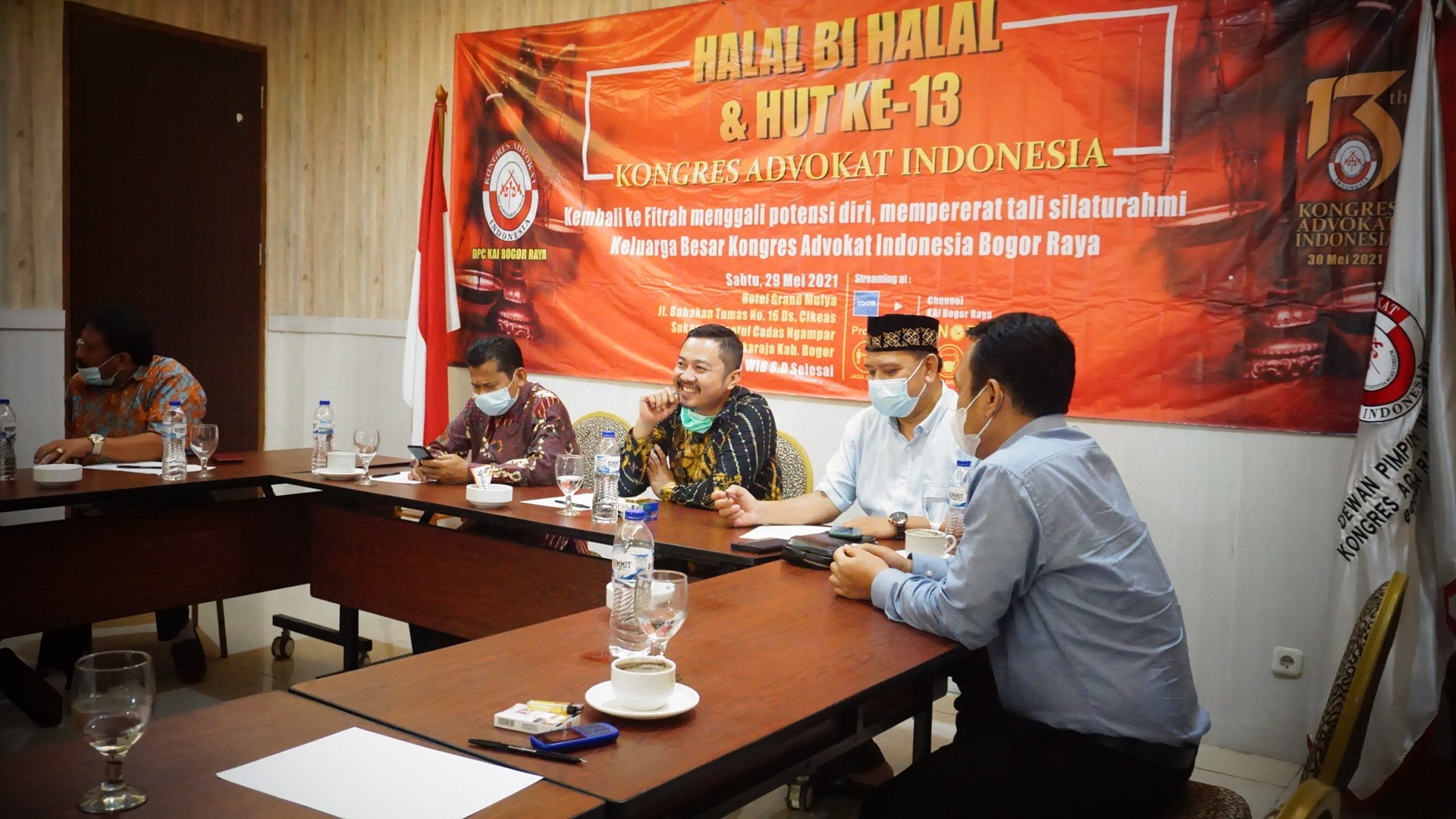 BOGORONLINE.com, SUKARAJA – Kongres Advokat Indonesia (KAI) Bogor Raya merayakan Hari Ulang Tahun ke 13 sekaligus halal bihalal di Hotel Grand Mulya, Kecamatan Sukaraja Kabupaten Bogor, Minggu, (30/05/2021).