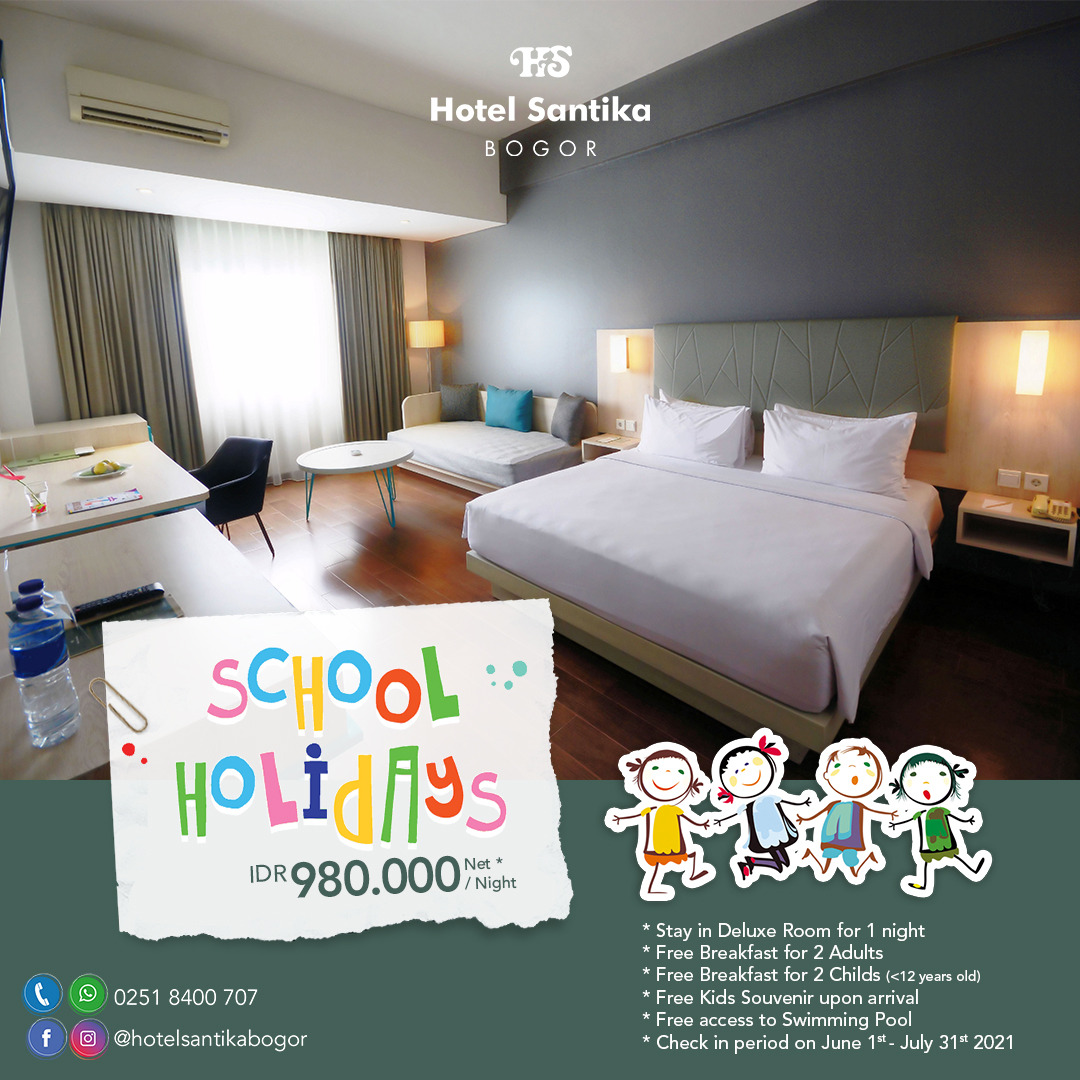 Hotel yang selalu memberikan sentuhan Indonesia ini memberikan penawaran menarik dengan meluncurkan promo berjudul School Holiday, promo ini berlaku mulai dari tanggal 1 Juni sampai 31 Juli 2021. Harga yang ditawarkan pun sangat terjangkau, dengan hanya Rp980.000 Net per malam per kamar Anda dan keluarga dapat menikmati nyamannya bermalam di kamar dengan tipe Deluxe Room, harga tersebut juga sudah termasuk sarapan pagi untuk 2 (dua) orang dewasa dan 2 (dua) orang anak – anak dibawah 12 tahun, selain itu Hotel juga akan memberikan kids souvenir pada saat check in.