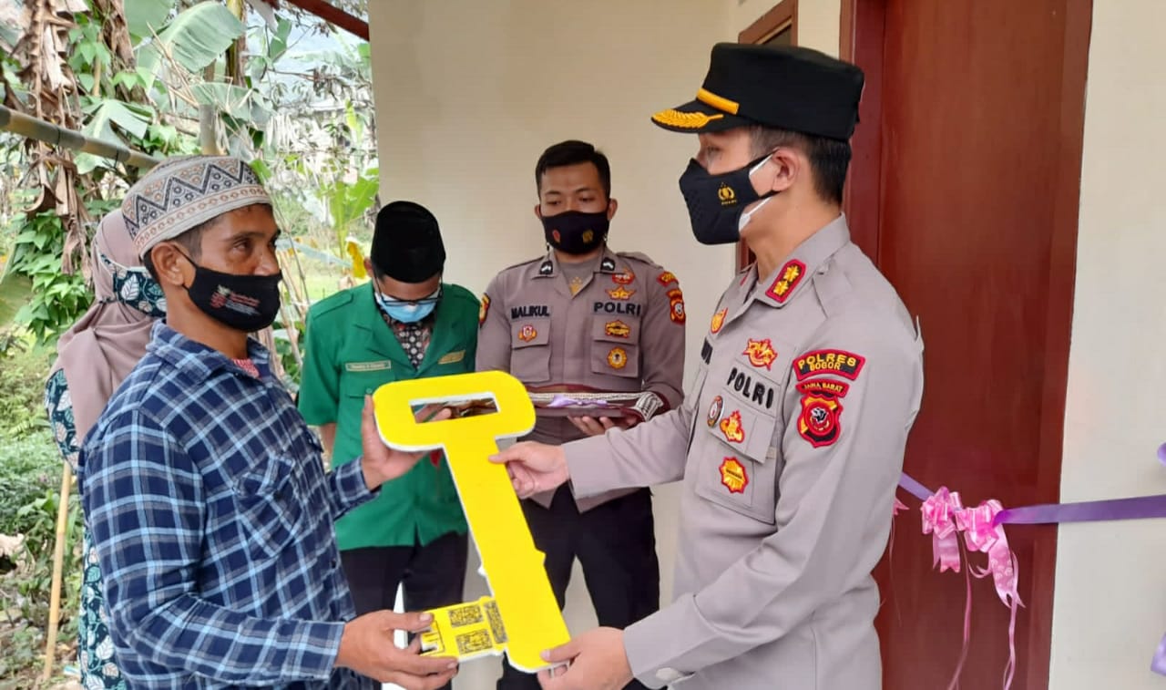 Dalam momen proses peresmian bedah rumah layak huni ini, ditandai dengan pemotongan pita dan pemberian kunci rumah oleh Kapolres Bogor AKBP Harun kepada bapak Apen.