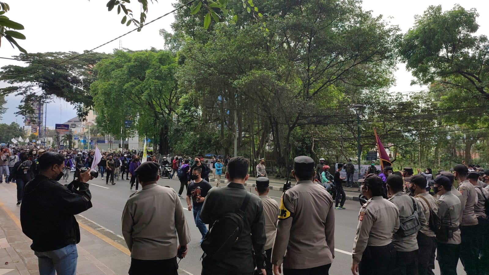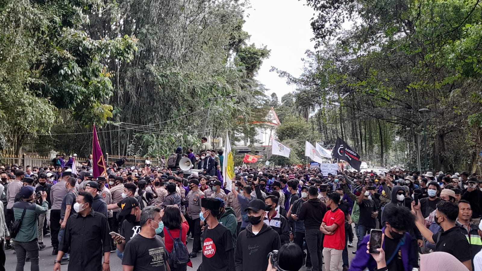 Selain menutut penundaan Pemilihan Umum (Pemilu) 2024 mendatang, ratusan Mahasiswa yang tergabung dalam Badan Eksekutif Mahasiswa (BEM) Se-Bogor menutut, turunkan harga minyak goreng (Migor) dan kebutuhan bahan pokok di Depan Istana Bogor Jumat (04/08/22).