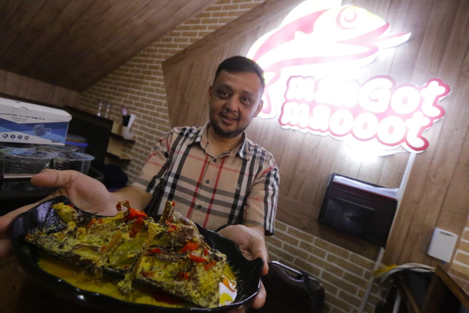 Mangut kepala Manyung menjadi menu spesial yang disajikan Resto Mangot Maooot Bogor yang berlokasi di Jalan Pangeran Asogiri, Ruko Hollywood Blok D No.5, Kelurahan Tanah Baru, Kecamatan Bogor Utara.