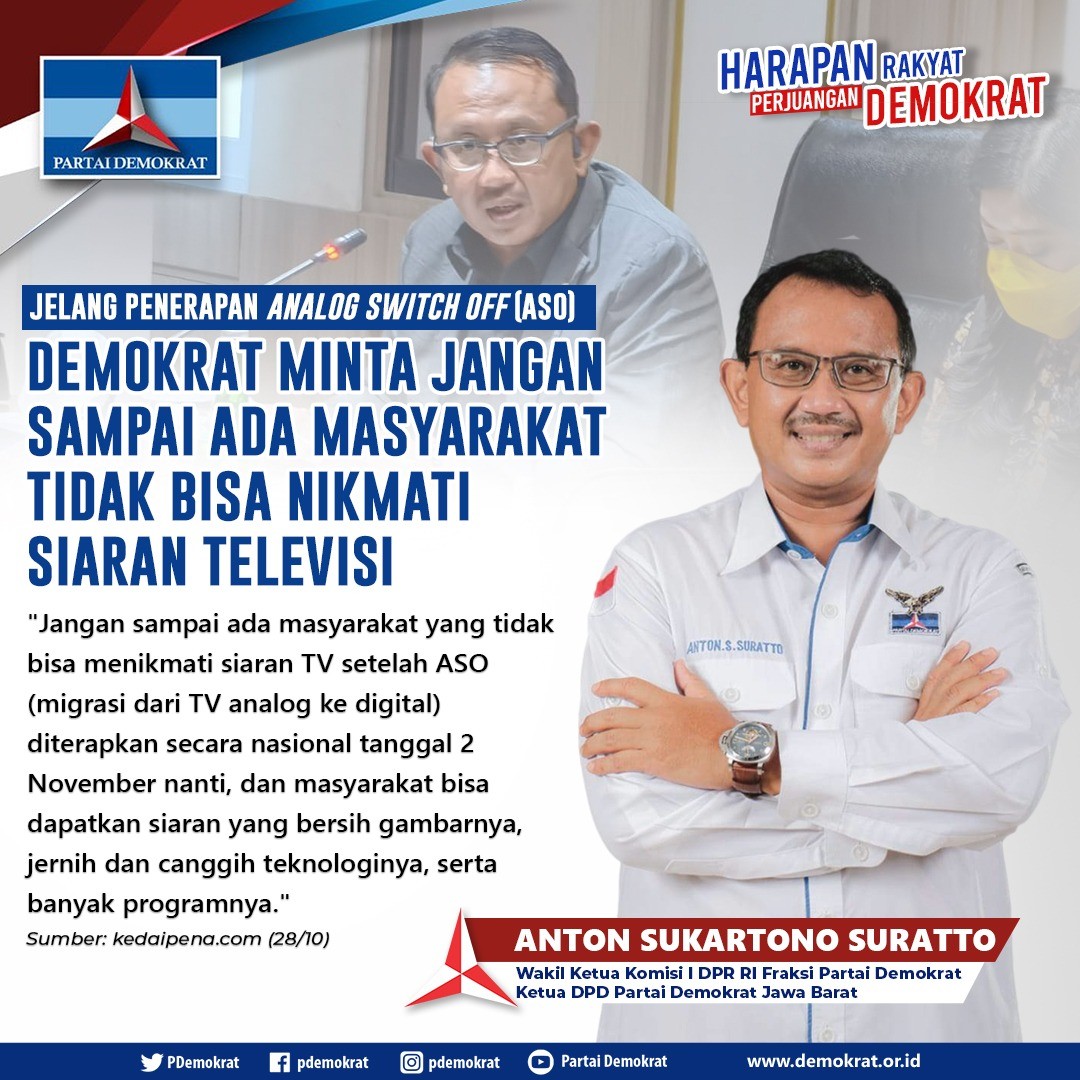 “Tujuannya agar masyarakat mendapatkan siaran yang bersih gambarnya, jernih teknologinya, canggih teknologinya dan banyak programnya,” ujar Ketua DPD Partai Demokrat Jawa Barat ini.
