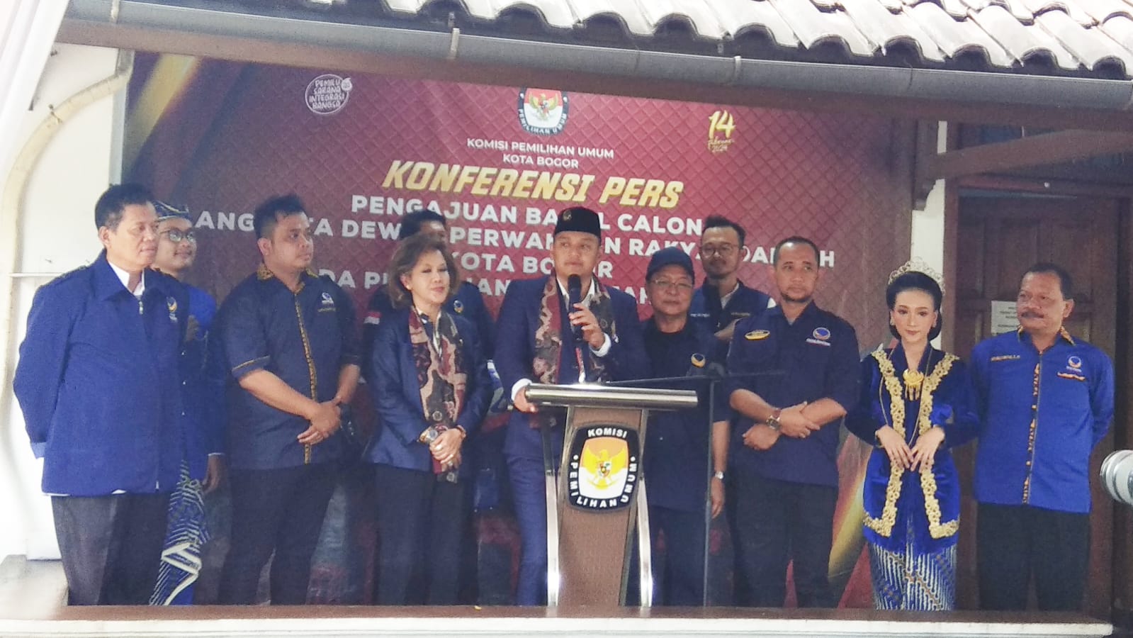 Ketua DPD NasDem Kota Bogor Benninu Argoebie memimpin langsung penyerahan berkas para bacaleg yang akan mengikuti kontestasi pada Pemilihan Legislatif (Pileg) 2024 nanti. Kedatangannya diterima oleh Ketua KPU Kota Bogor Samsudin.