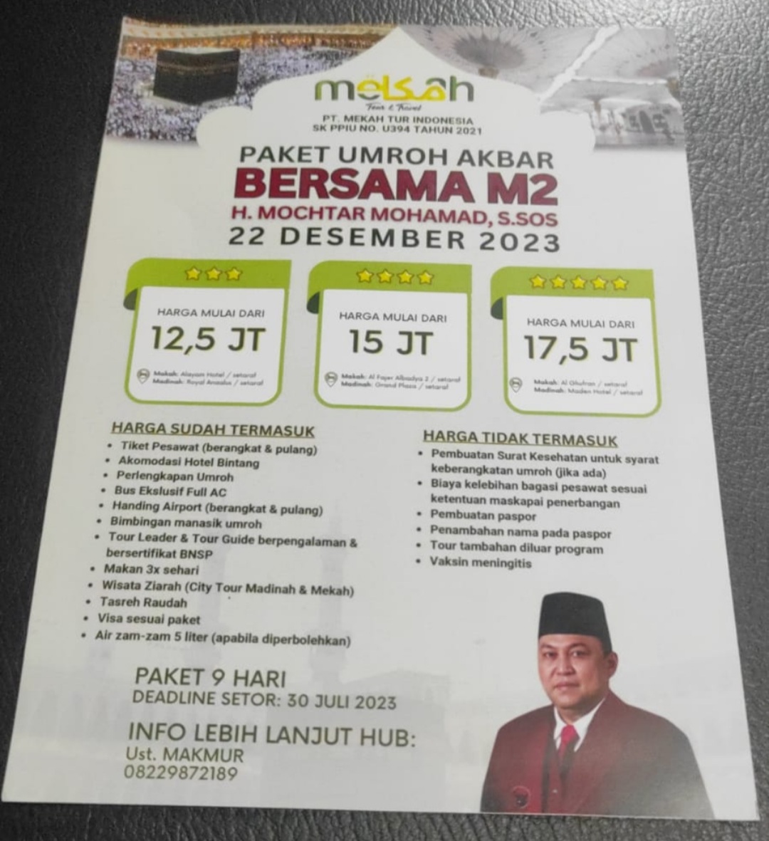 “Saat itu M2 jadi Caleg, nah tim nya menawarkan umroh subsidi sudah setahun lalu. Sudah dibayar, namun sampai saat ini masih belum ada kejelasan,” kata dia, Minggu 7 Juli 2024.