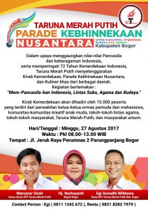 Lima Belas Ribu Peserta Akan Ramaikan Parade Kebhinekaan Nusantaraberanda, Bogor Raya, Headline|26 August 2017by Aldi SupriyadiBOGOR – Dalam rangka memperingati 72 tahun Kemerdekaan Indonesia, Taruna Merah Putih
