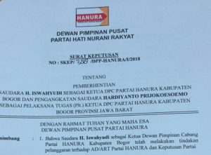 Iswahyudi Dipecat Dari Ketua DPC Hanura Kabupaten Bogorberanda, Bogor Raya, Cibinong Raya, Headline|26 January 2018by Aldi SupriyadiCibinong – Dinilai telah melakukan tindakan pelanggaran Anggaran Dasar / Anggaran Rumah